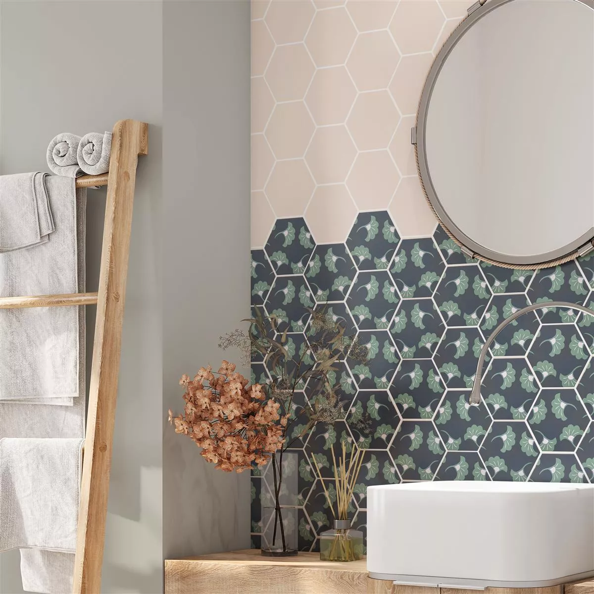 Pločice od porculanskog kamena “Modena Hexagon Decor 3” spajaju umjetnost i funkcionalnost. S debljinom od 10 mm idealni su za mokre prostore, tuševe, kupaonice, kuhinje, dnevne sobe i unutarnje prostore. Mat površina i ornamentalni motiv u plavoj i zelenoj boji daju pločicama jedinstvenu estetiku.
